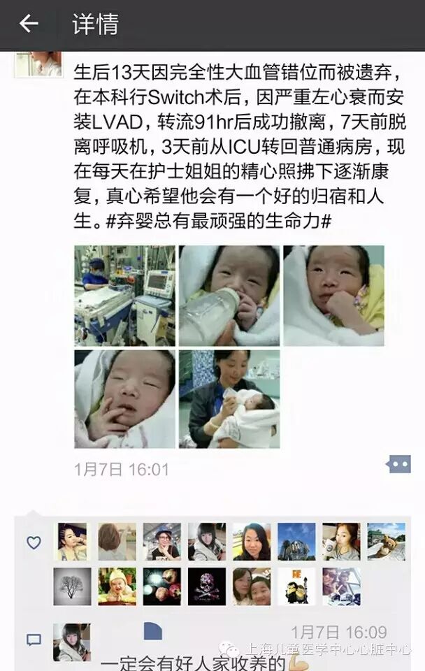 【快讯】不离不弃 再创奇迹没名没姓,“浦弃xx”和他的随身物品一起包在一个快递包裹里被亲身父母遗弃在医院里。因为罹患复杂的大血管转位,他被紧急送到我院CICU救治。完全性大血管转位是新生儿先心病的头号杀手,如果不在出生后的一周内实施Switch手术就会错失最佳救治时机,患儿会因为心室功能衰竭而迅速死亡。但是弃婴被送医时没有任何出生时间的证明,仅从能体貌特征上推断为十几天的新生儿。时间就是生命!我们在最短的时间里落实了爱心救助,心脏中心的医疗团队为弃婴即刻施行了急诊大血管换位(Switch)手术。 由于各项准备充分,手术过程十分顺利,但是因为术前他内环境的紊乱加之年龄的不确定性,在经历了根治手术后,患儿左心室功能退化程度远远超过了预期:术后当天就出现了血压心律不稳定和气道内出血的危急状况,即使在大剂量的强心药的作用下仍没有明显好转。 危急时刻,命悬一线!在重症监护室里,我们的医护团队又一次和时间进行着赛跑,一方面,医生当即果断床边开胸进行心肺复苏,另一方面,体外团队也在最短时间内作好了为患儿安置心室辅助装置的准备。心室辅助装置VAD(ventricular assist device) 是利用离心泵和管道将血液由静脉系统或心脏直接泵出后再输入动脉系统或心脏的机械辅助装置。通过机械的工作让心室减压,心脏得到了充分的休息后心功能才能得以恢复。但是因为其技术要求高,一般都需要在手术室内完成。而此时小弃儿的那颗小心脏已在崩溃的边缘,已经丧失了进入手术室安装的机会,只能在床边安置。这是个惊心动魄和死神短兵相接的时刻:一边是胸外科医生不停歇地做着心内按摩,一边是体外灌注师们在床边快速地完成预充,另一边是护士们忙碌地在狭窄的床单位和仪器间隙穿梭给药、输血、做血气。倚赖这支团队常年累月的磨合和丰富的经验,一切都在默契中飞快地运行着。当VAD的泵头转起来、鲜红的血液在管道中流淌时,浦弃高悬不下的心室压力下来了,低迷的血压上升了,在场的每个人都不约而同地抒了一口气,抬头看时间,整个抢救过程居然不到一个小时。一位年轻的医生对着胸腔打开的浦弃轻声说道:“或许你父母不希望你活着,但是我们真的希望你活”。 正是应了这句话,我们的监护团队不离不弃地守护着这个弱小的生命,在艰难地度过了一道又一道的难关后,患儿坚强地活过了循环辅助的91个小时,在圣诞节当天成功撤离VAD,他自己的小心脏也终于能够平稳地工作,维持血压了。他是目前历经VAD辅助循环后存活的年龄最小、体重最轻的小患儿,而且得益于及时的干预措施没有发生预期中的多脏器衰竭等并发症。这般奇迹无疑是对全体医护人员最好的礼物。 现在,小弃婴已经回到了普通病房,病房的医生护士给他起了个可爱的名字:小七。一时间,可爱的小七也刷爆了医生护士的朋友圈。如今小七安静地躺在病房护士的怀中,吸吮奶瓶非常有力,眼睛明亮有神,只要有人陪在身边就不哭不闹,恢复良好,再过两天就能拆线出院了,如果不是胸前参差的伤口,看不出曾经经历过生死劫难。尽管父母抛弃了他,但是素不相识的医生护士们给了他第二次生命,愿他能健康成长将奇迹延续! |