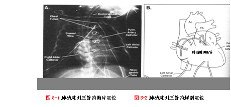 当肺泡膨胀至正常FRC时肺血管阻力最低,膨胀不足(如肺不张、气道塌陷)时,由于肺容积降低,压迫肺微循环,PVR会升高;反之过度膨胀或呼气末正压(PEEP)过高也会增加PVR,这是肺泡壁毛细血管受压或直接刺激血管收缩所致。 (二)肺血管阻力增高的病理分级 Heath和Edwards对PVR增高的病理改变进行了6级分级,包括Ⅰ级:肺小动脉中层平滑肌增厚;Ⅱ级:内膜细胞增生;Ⅲ级:内膜增厚和纤维化,有时伴早期广泛血管扩张;Ⅳ级:广泛性血管扩张及局部区域的丛样改变;Ⅴ级:内膜中层广泛纤维化,血管瘤样改变;Ⅵ级:坏死性动脉炎。一般认为,Ⅲ-Ⅵ级为不可逆病变,即肺血管梗阻性疾病(Pulmonary Vascular Obstructive Disease,PVOD)。肺形态学研究对伴先心病的肺血管病理改变更好地提供了定量分级,即A级:平滑肌细胞外周化,伴或不伴中膜增厚;B级:平滑肌远端扩张以及中膜较正常增厚1.5-2倍(轻度),较正常增厚≥2倍(重度);C级:外周肺血管相对肺泡密度下降<50%(轻度),下降≥50%(重度)。 (三)心脏病术后肺血管阻力增高的危险因素 (1).生后1-2天的新生儿 由于PVR在出生后最初几天内相对较高,且更为重要的是正值肺血管结构从胎儿型向成人型转换,极不稳定,因此心脏手术(如完全性大血管错位,室隔完整型肺动脉闭锁)除非必须,应尽量避免在生后24小时内进行。 (2).伴肺静脉高压的婴儿和大龄儿童 如梗阻型完全性肺静脉异位引流或限制性房间隔的左室发育不良综合征的婴儿,办膜病变病儿。 (3).先心病合并PVR增高的婴儿和大龄儿童 婴儿型肺动脉结构的演变在某些大量左向右分流的先心病中常不能正常进行,如不经早期手术,生后数月内即可迅速发展为PVOD。这类病种有大血管错位伴室间隔缺损、永存动脉干、完全性房室通道(尤其合并21-三体畸形)、单心室不伴肺血流梗阻、大型室间隔缺损或多发性室间隔缺损、大型动脉导管未闭。 (4).术前心导管资料提示器质性肺高压可能 根据上海第二医科大学附属新华医院对50例左向右分流先心病伴重度PH(Pp/Ps≥0.8)患儿的回顾分析:年龄>2岁、肺小动脉阻力>9wood单位、肺小动脉楔压<12mmHg、肺循环/体循环血流量(Qp/Qs)<2、动脉血氧饱和度<95%五项指标中3项或3项以上改变者多提示器质性肺高压可能,术后肺高压发生率高。 (5).机械性梗阻 常见心内畸形纠治术后仍存在残余左向右分流或残余肺动脉分支梗阻、肺静脉狭窄或肺栓塞。 (6).其他因素:肺实质病变,左房压增高,血粘度增高等 (7).不明原因PVR增高 无法以心内畸形解释的肺高压,如2月患儿室间隔缺损合并PVR/SVR=1,可能为原发性肺高压。 (8).肺静脉压力增高 肺高压也可出现于肺静脉压增高者。新生儿见于肺静脉梗阻疾病(如梗阻型完全性肺静脉异位引流)或房室瓣闭锁在肺静脉侧心房且房膈完整(如单心室/二尖瓣闭锁/房膈完整);大龄儿见于左心梗阻性疾病如二尖瓣狭窄等。 (四)先心病术后肺高压的临床表现和监测方法 (1).临床表现 术后肺高压可表现为反应性肺高压和肺高压危象。反应性肺高压常发生于术后初48-72小时内,肺动脉收缩压快速上升≥2.66 KPa(≥20mmHg),并出现烦吵不安,大都持续时间短暂约5-10分钟,多数由于气道内吸引操作引起,对镇静剂、肌松剂和皮囊纯氧过度换气反应良好。若肺动脉收缩压迅速上升,而体动脉收缩压变化不大或下降则为肺高压危象。此时因肺动脉压迅速上升,右心室收缩期超负荷,导致右心衰竭、左心充盈减少,同时扩大的右房、右室造成体循环灌注压低,最终导致严重低心排血量综合征。低氧、高碳酸血症、代谢性酸中毒、烦躁以及气道内吸引等均是诱发因素,尤其好发于完全性肺静脉异位引流、永存动脉干、完全性房室通道、大血管错位伴室间隔缺损术后,若不及时诊治死亡率高。资料显示VSD伴肺高压者术后死亡率比无肺高压者高2.6倍。 肺高压患者心电图表现为右心室肥厚,如右心前区导联高大R波、电轴右偏以及右心室劳损。一般肺动脉压力越高,心电图表现越敏感。胸片显示肺动脉段凸出,肺充血。 (2).监测方法 对术后易并发肺高压的高危患儿,有必要在术中经右室流出道预先放置肺动脉测压管,其优点能术后连续直观评估肺动脉压力。依靠胸片判断肺动脉测压管位置是正确评价肺动脉压力的前提(见图8-1,8-2),如测压管插得过深,则所测压力仅代表肺小动脉楔压,造成人为低估肺动脉压力。二维心超多普勒检查通过识别三尖瓣返流以及平均右房压/三尖瓣射血流速峰值的比值亦可估测肺动脉压力,其优点为无创伤性,且能同时诊断术后残余解剖问题。