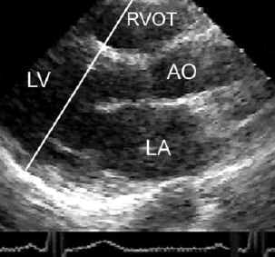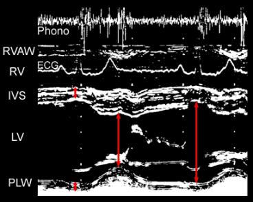 Correct positioning of M-mode cursor in the transthoracic parasternal long axis view to obtain the standard left ventricular M-mode tracing as shown above.