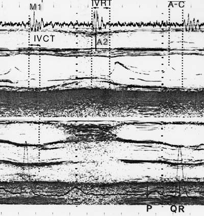 Time intervals Isovolumetric contraction time & Isovolumetric relaxation time Superimposed and synchronized M-mode tracings of the left ventricle with mitral valve (upper panel) and aortic root (lower panel). Phonocardiographic tracing at upper end and ECG tracing at lower end of figure. A2: First high frequency component of